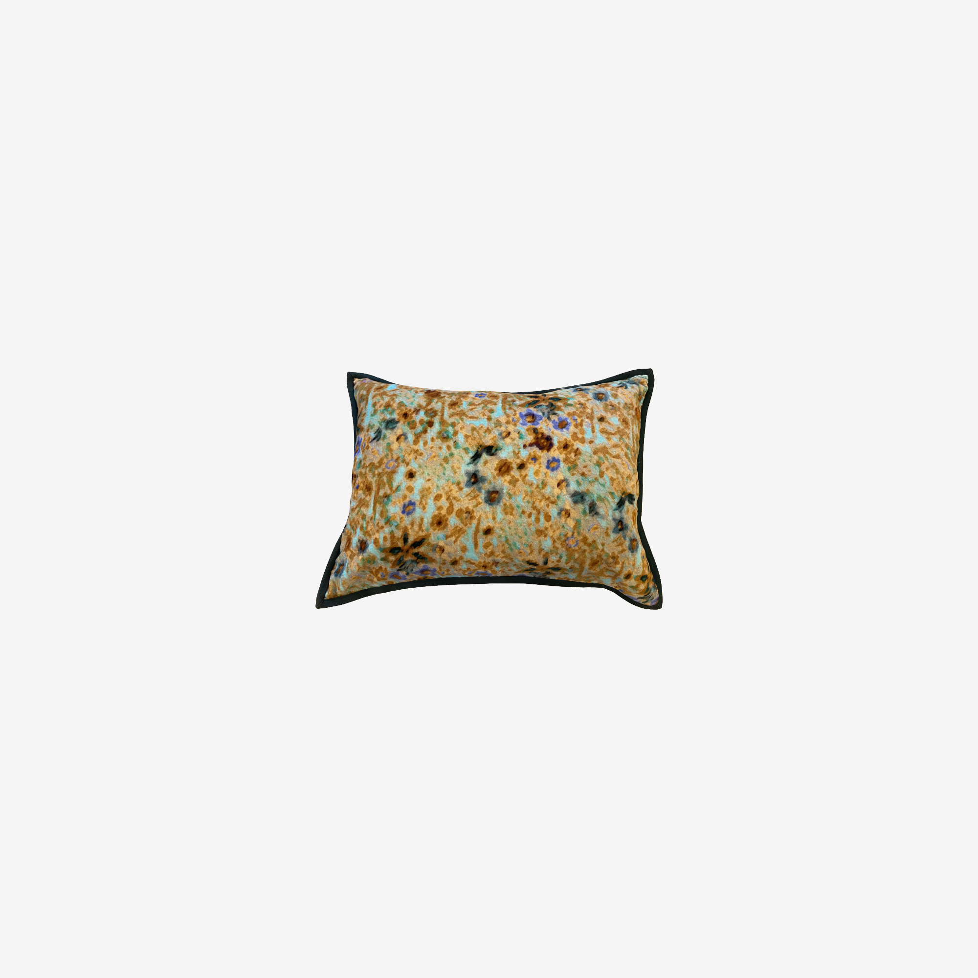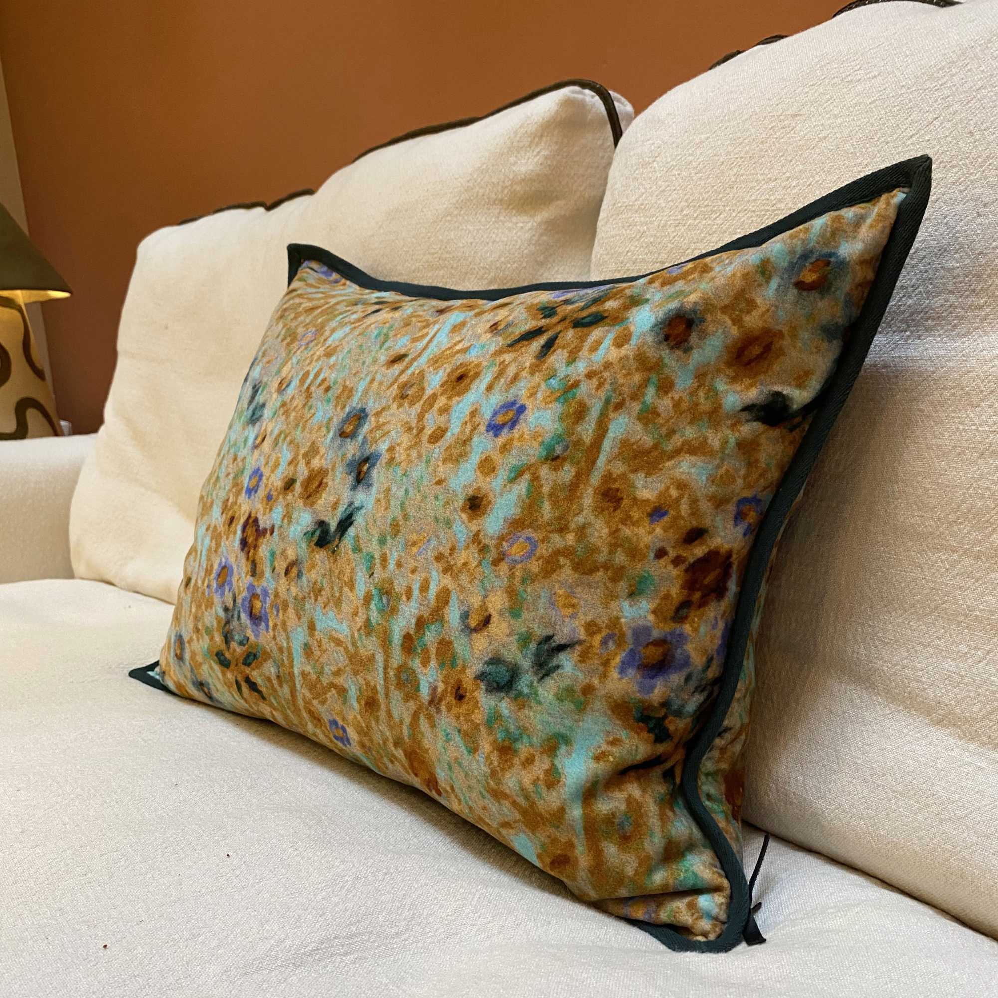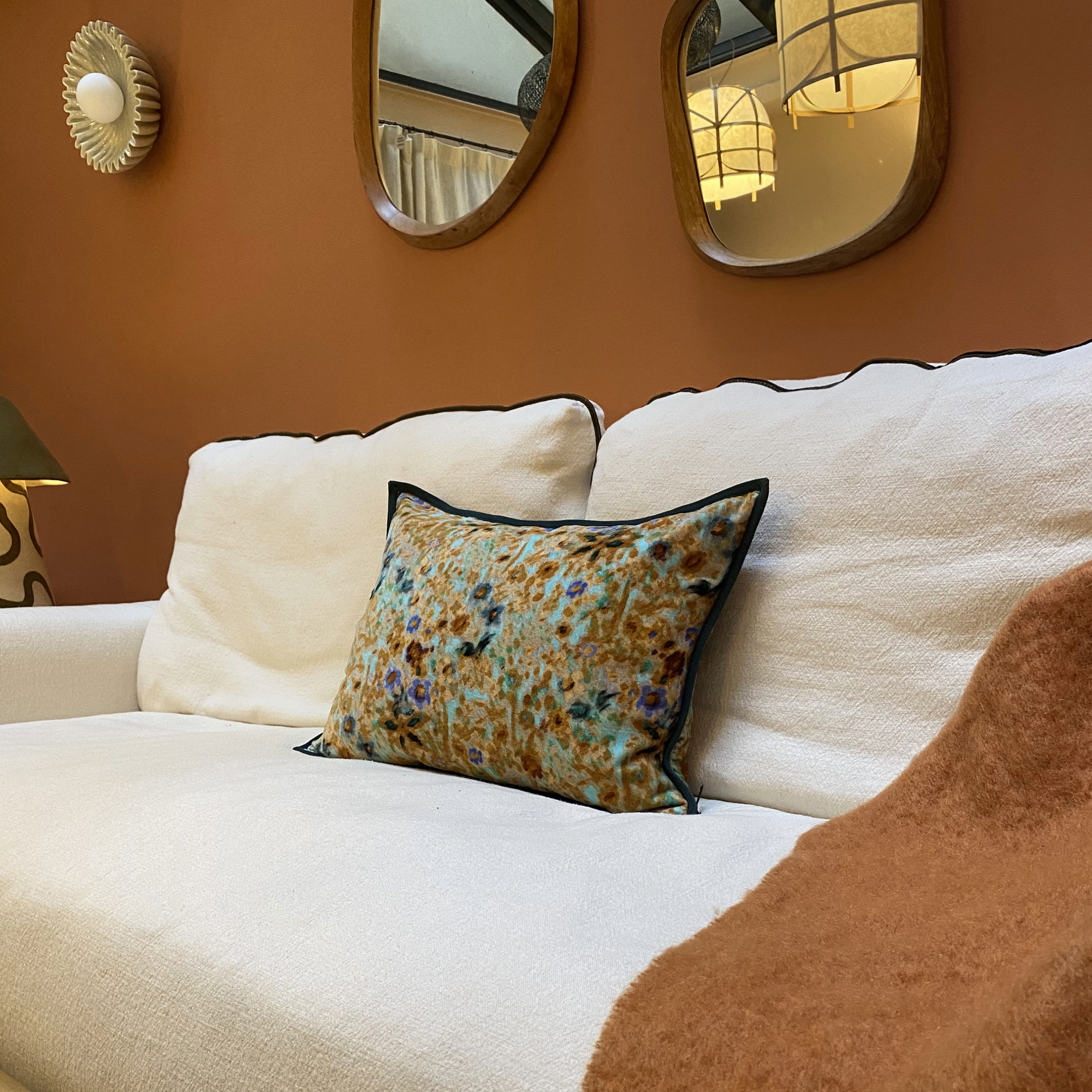 Le coussin Miami Atlantique de la marque Élitis, en velours imprimé aux couleurs chaudes et réconfortantes et au motif fleuri,  idéal pour réchauffer votre intérieur et ajouter de la couleur avec élégance.