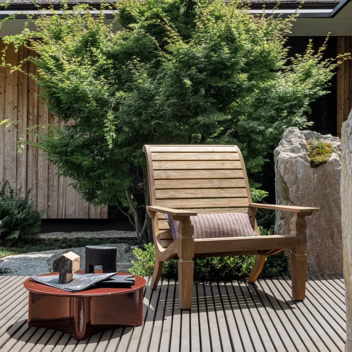 Fauteuil de style colonial et d’inspiration exotique, Jeko 26 possèdent une structure en éco-teck. Ce matériau provient de la valorisation de poutres et d’éléments de récupération en teck, qui sont réparés avec du bois recyclé, assemblés puis polis afin de mettre en valeur les veines d’origine du bois. Coussin cale-reins 60×30 cm, déhoussable.