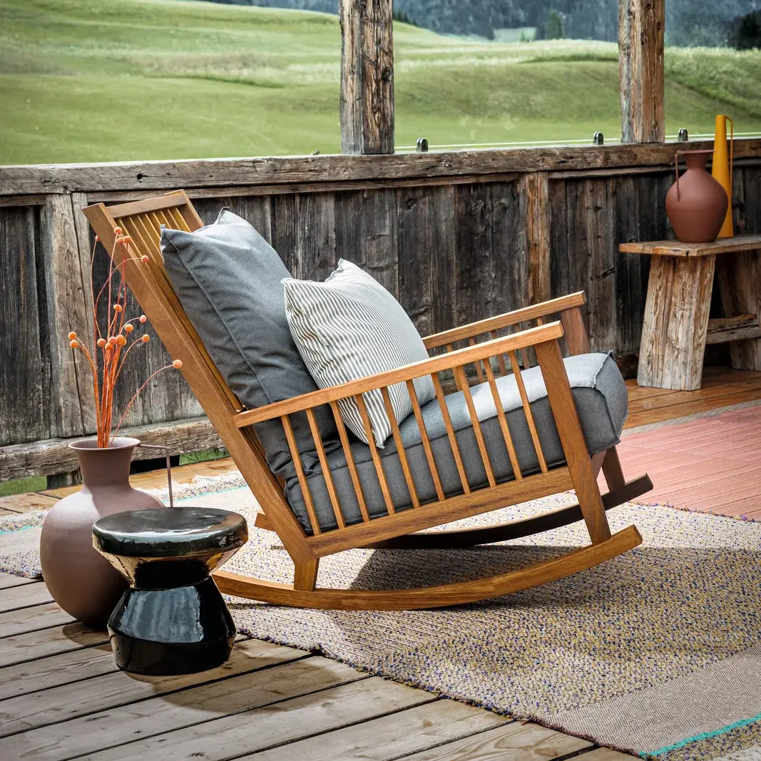 Fauteuil Rocking-chair InOut 709 à bascule, structure en iroko huilé.