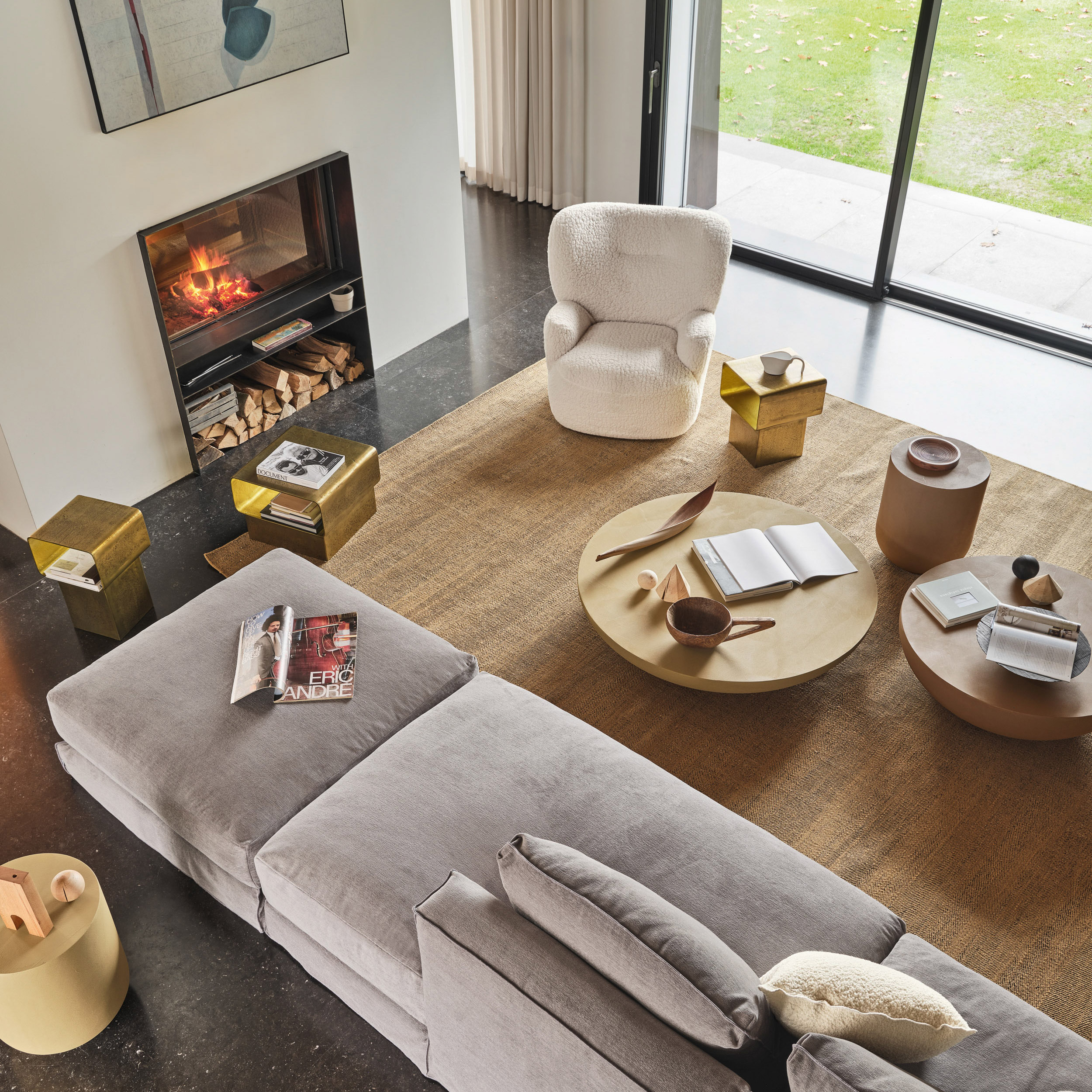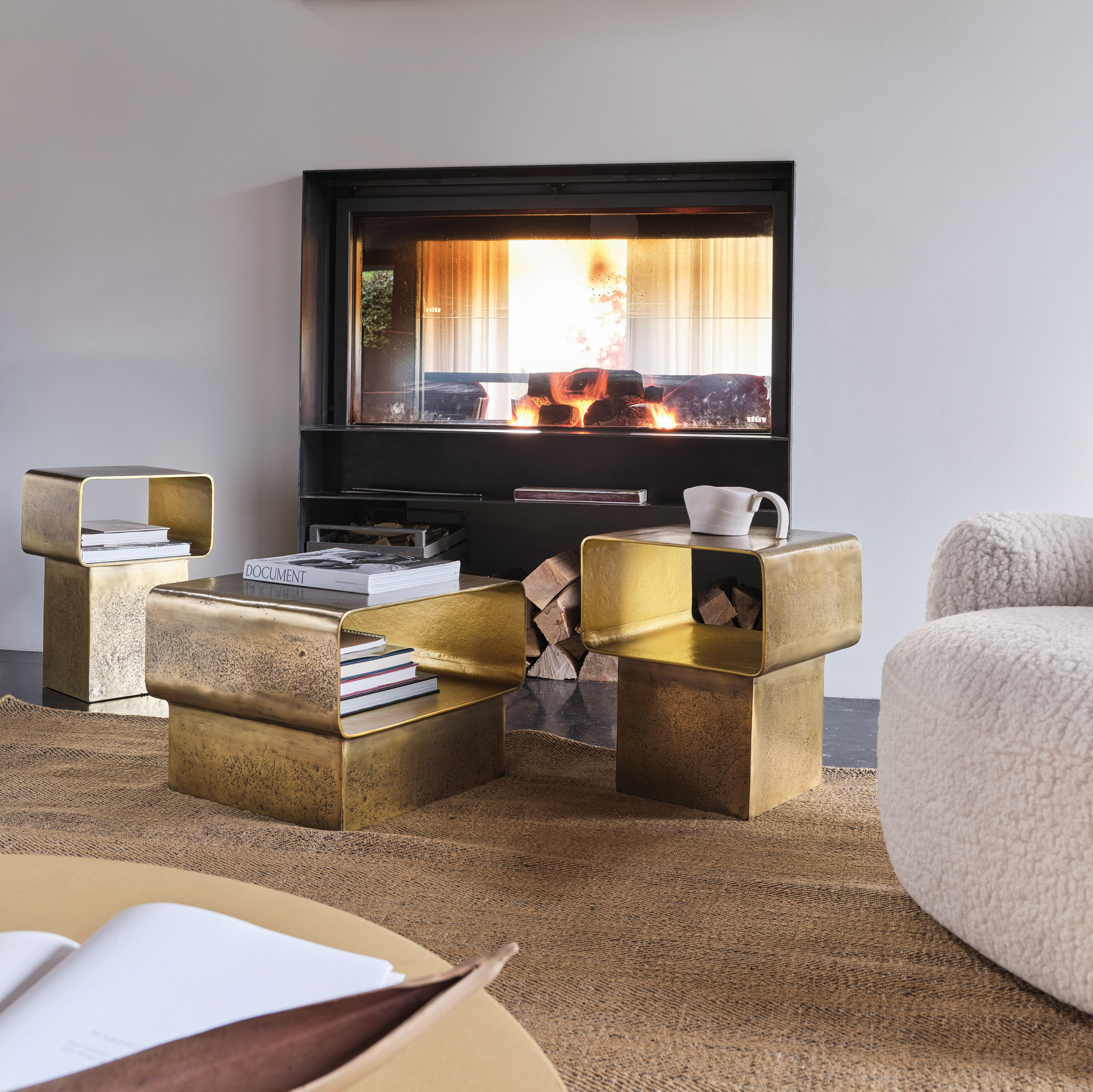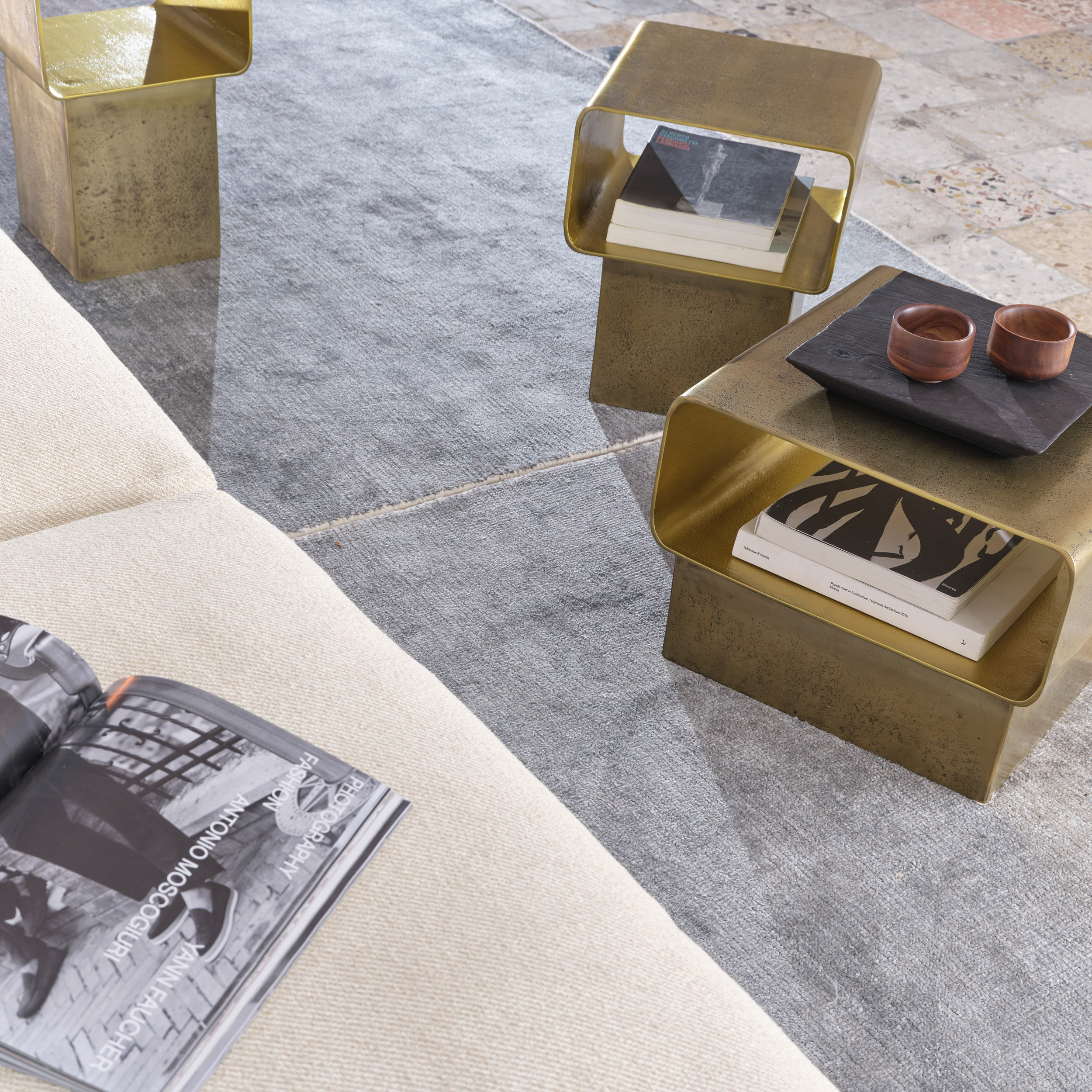 La table basse Kira 46, signée Marta Giardini, séduit par son design sculptural mêlant pleins et vides. En aluminium coulé, elle allie une base cubique à un plateau carré aux coins arrondis, sublimée par des finitions Gold ou Chrome au style industriel chic.