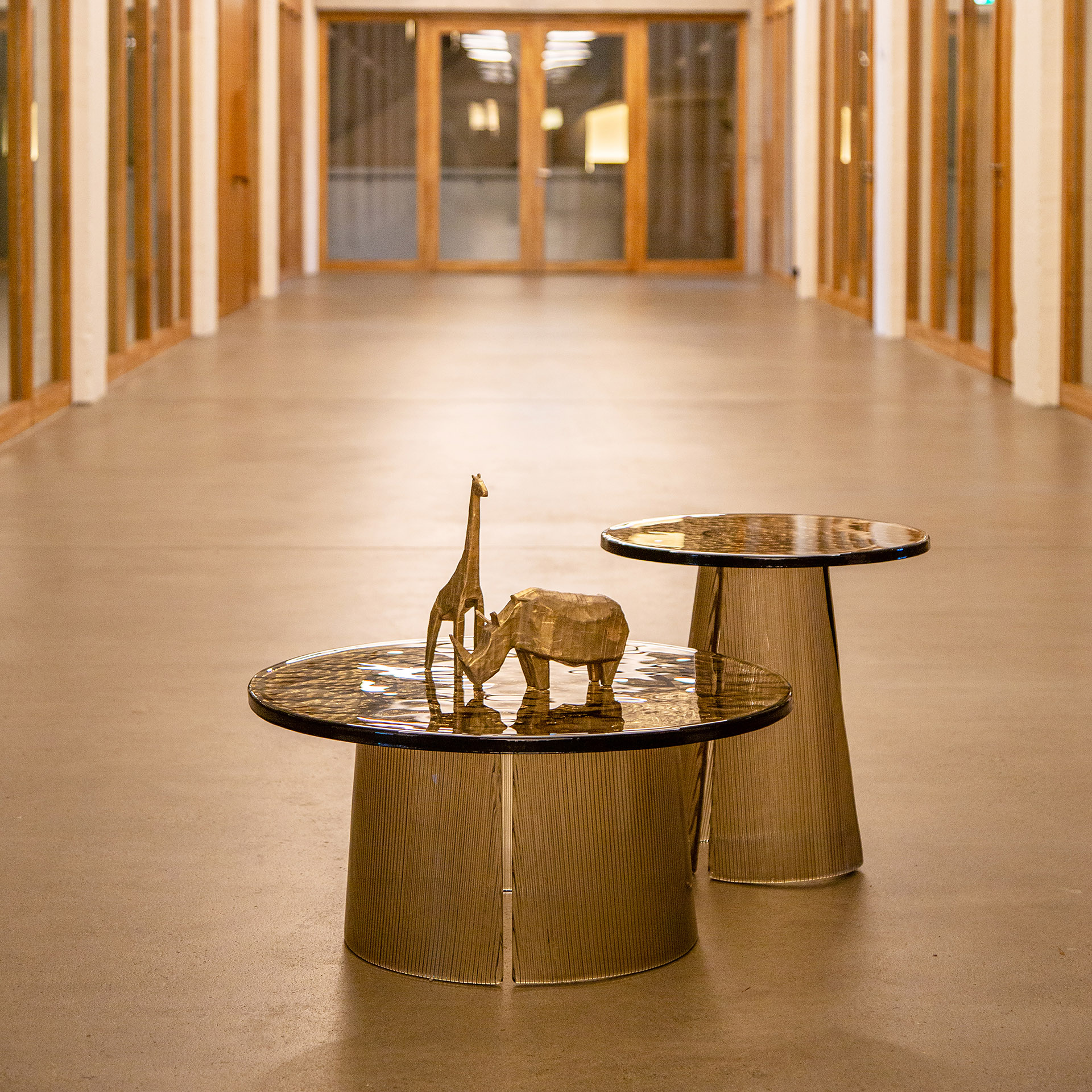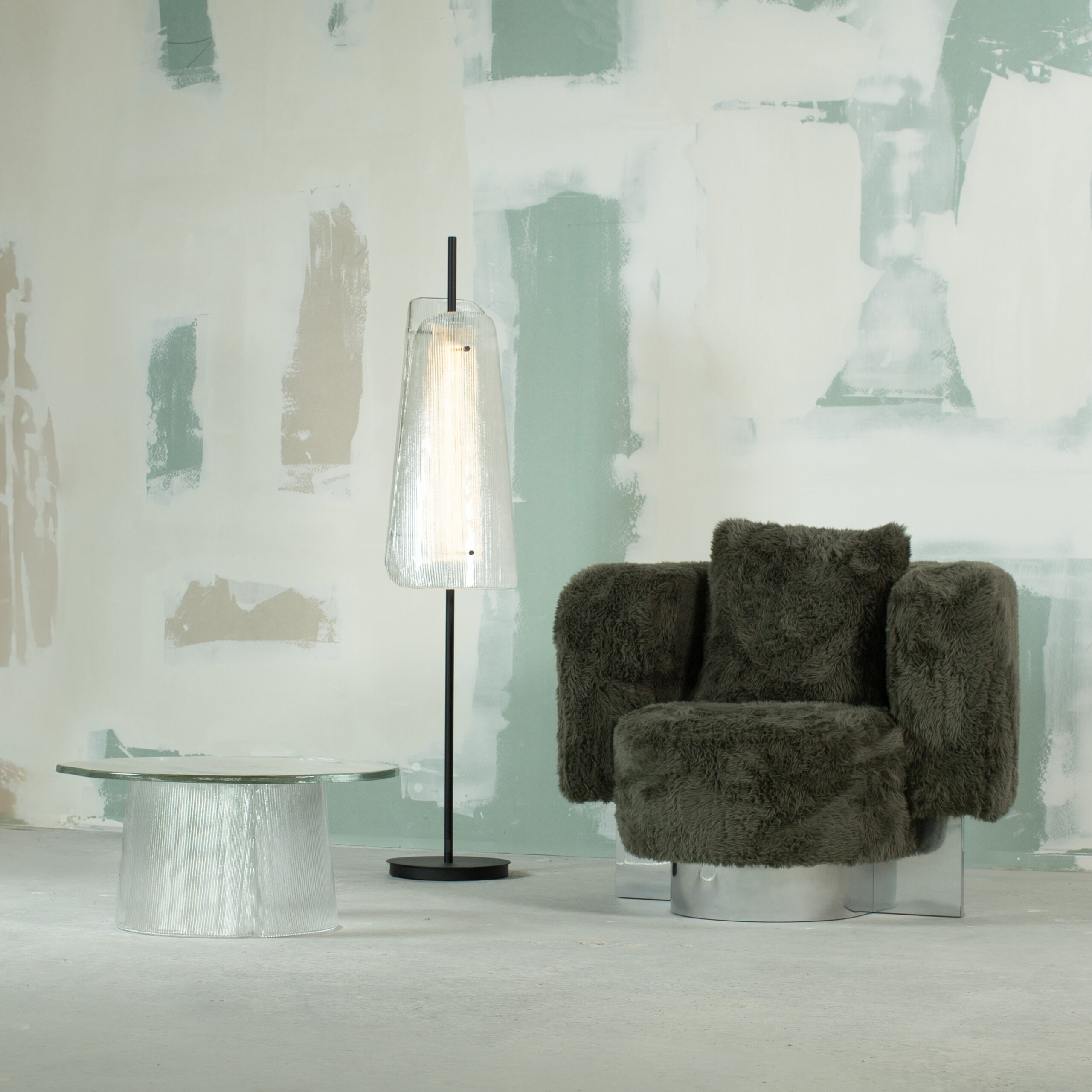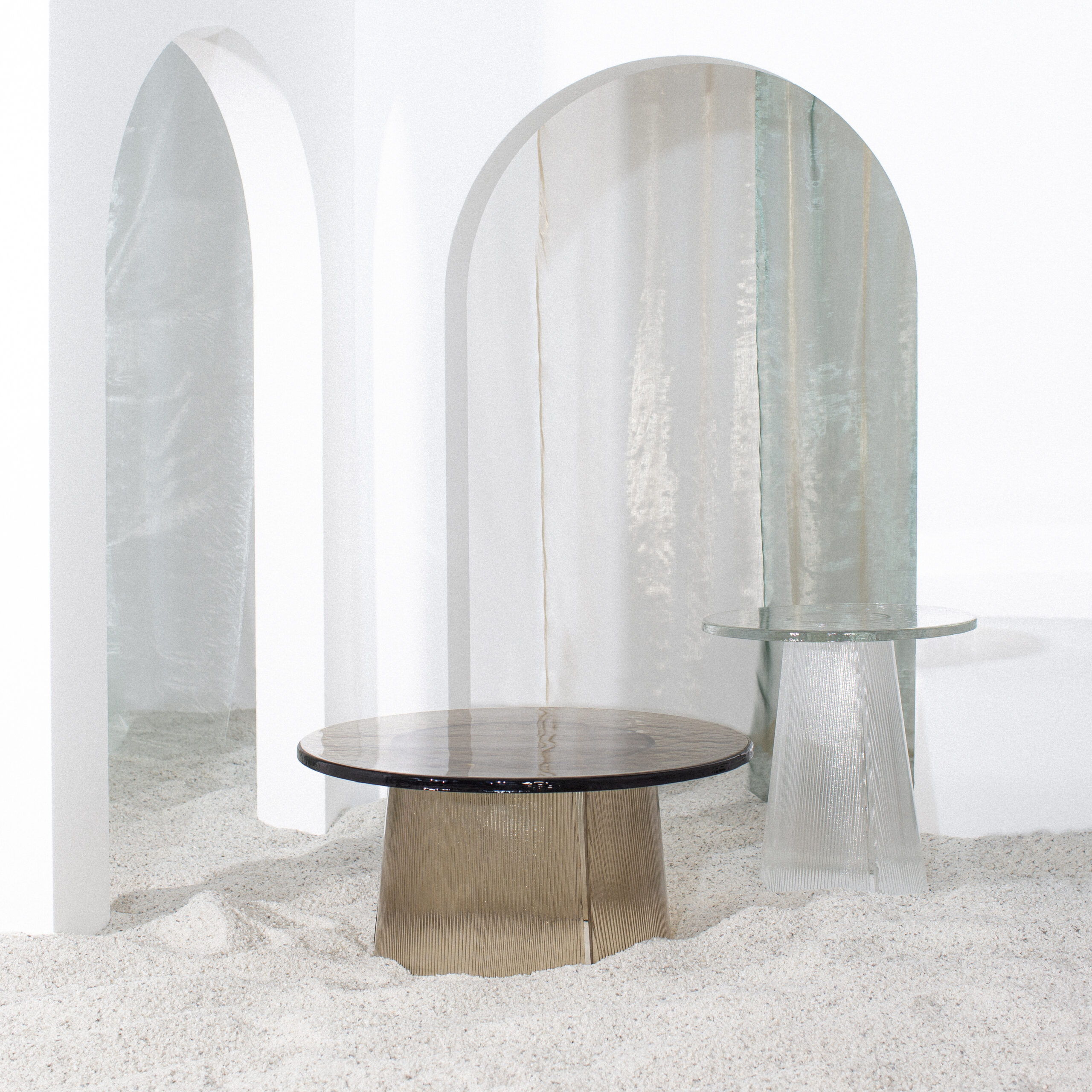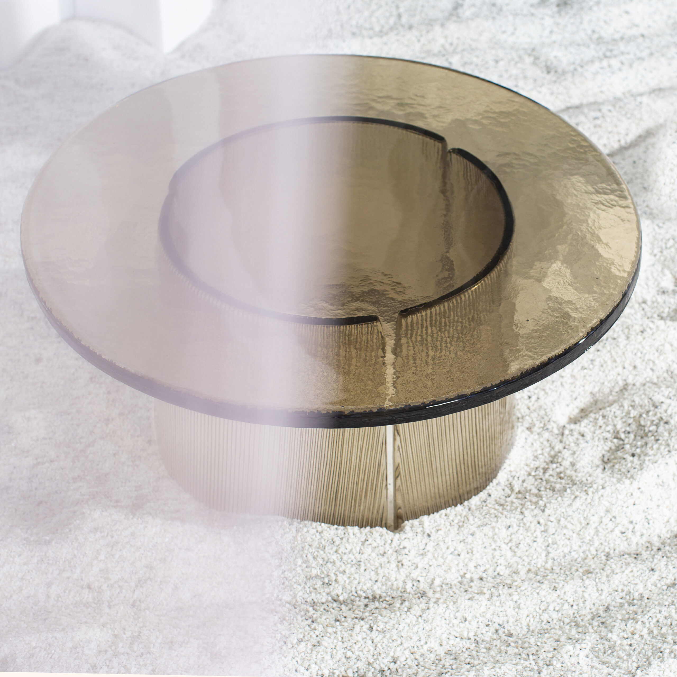 Chaque table est soufflée et formée à la main. Ces légères variations confèrent à chaque pièce un caractère unique. Ce travail artisanal, emblématique de la philosophie Pulpo, célèbre la beauté du geste et la richesse des imperfections. De plus, le choix du verre teinté ou transparent amplifie la perception de la lumière. Il transforme Bent en un véritable objet lumineux.