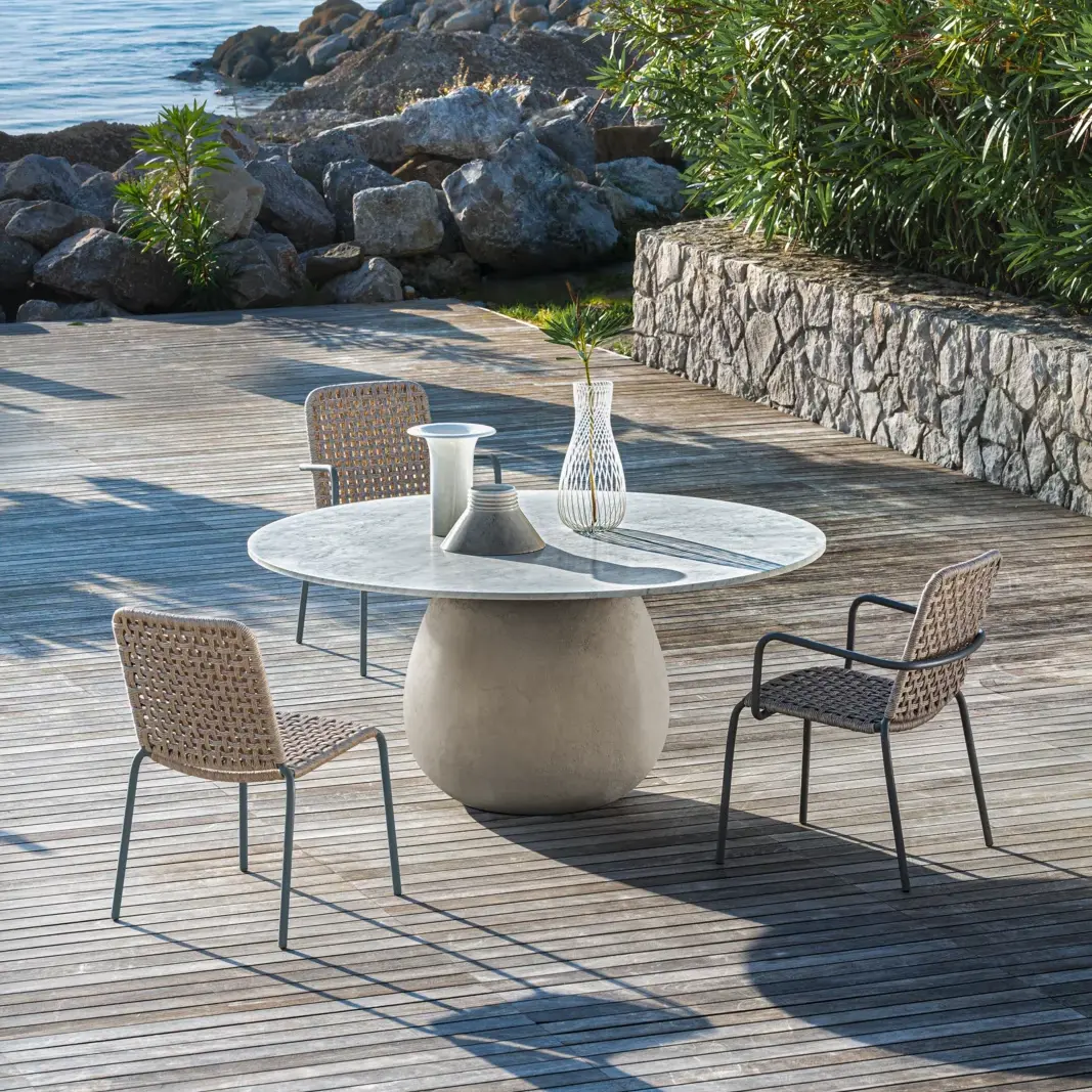 La table InOut 836 éditée par Gervasoni et conçues par Paola Navone, incarnent une vision sculpturale et hors du temps de l’extérieur. Elles associent la plénitude des formes arrondies à un contraste affirmé de matières et de textures.