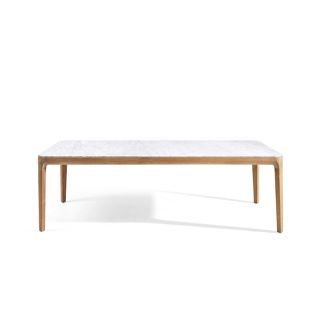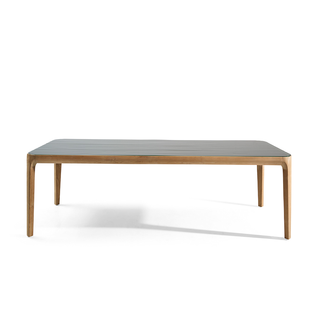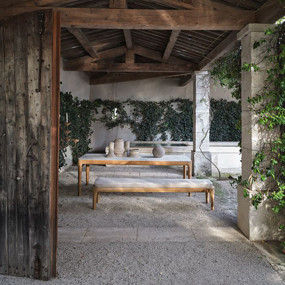 Le piètement en teck naturel apporte chaleur et stabilité à l’ensemble. Ce bois, choisi pour sa résistance et son aspect intemporel, structure la silhouette de la table. En contraste, le plateau se décline en plusieurs finitions. Il est disponible en marbre blanc de Carrare, en béton Pearl, en grès Lava Stone ou en verre texturé peint au dos en vert. Chaque matériau offre une lecture différente du modèle.