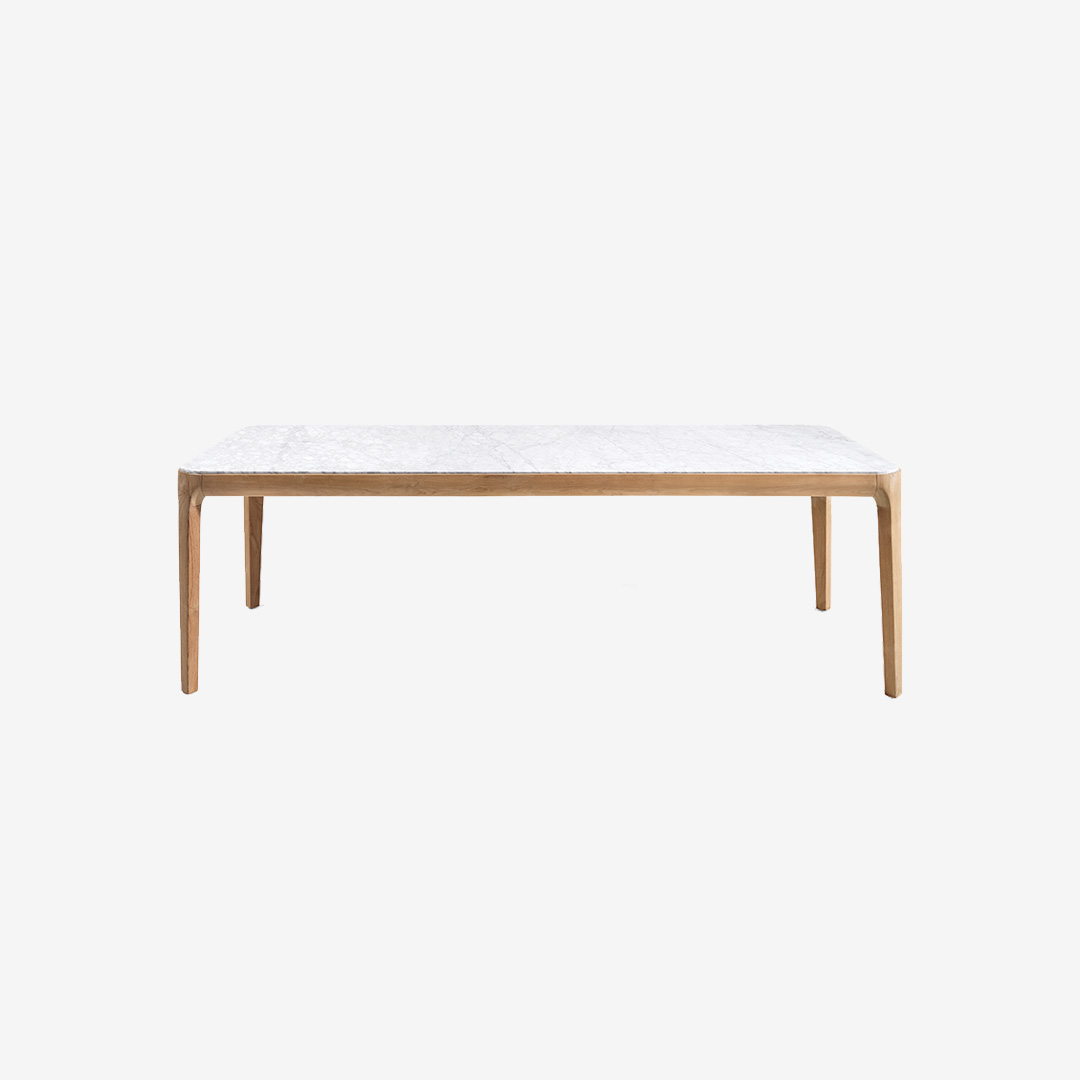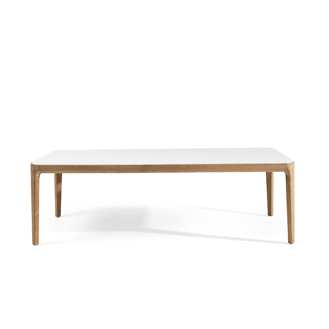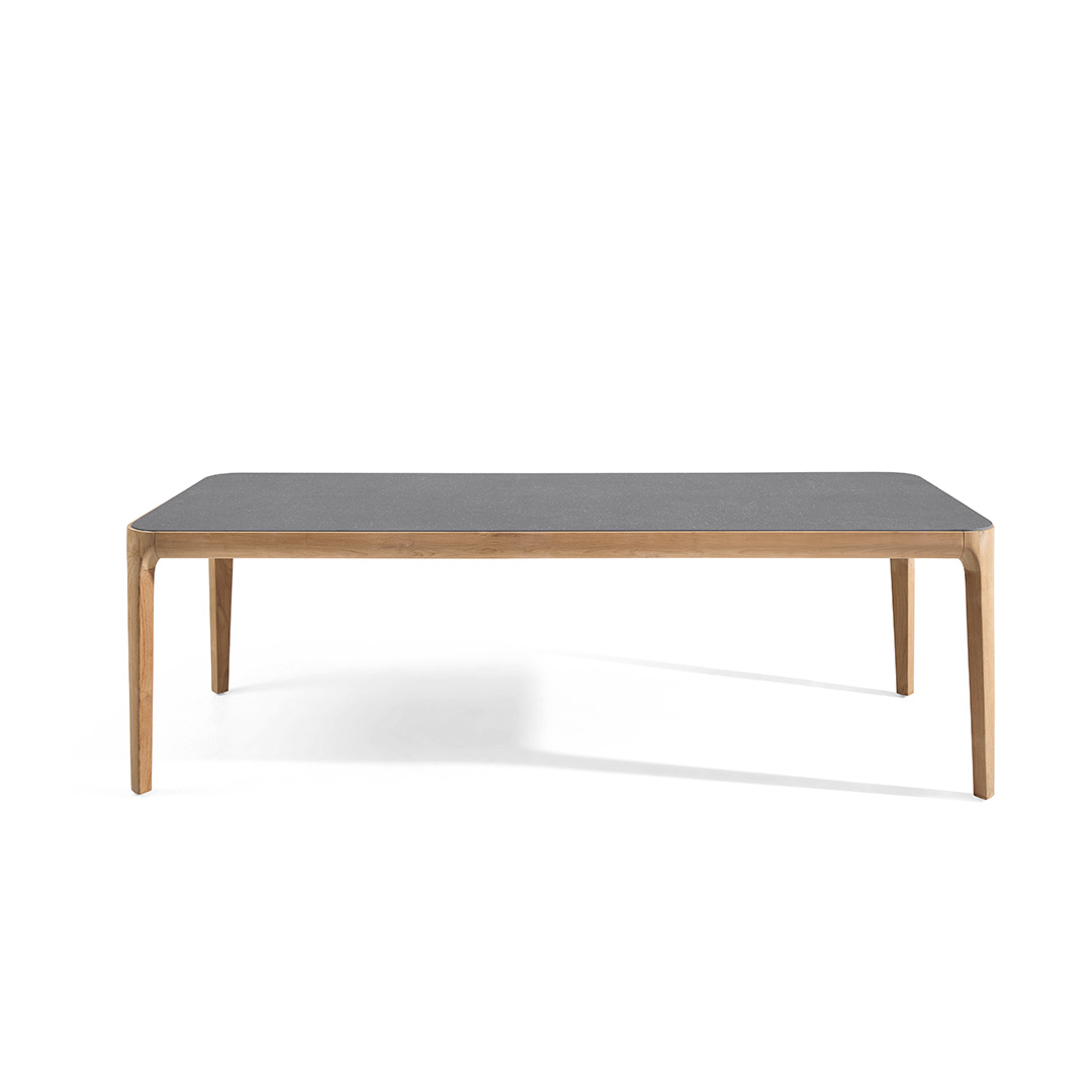 Le piètement en teck naturel apporte chaleur et stabilité à l’ensemble. Ce bois, choisi pour sa résistance et son aspect intemporel, structure la silhouette de la table. En contraste, le plateau se décline en plusieurs finitions. Il est disponible en marbre blanc de Carrare, en béton Pearl, en grès Lava Stone ou en verre texturé peint au dos en vert. Chaque matériau offre une lecture différente du modèle.